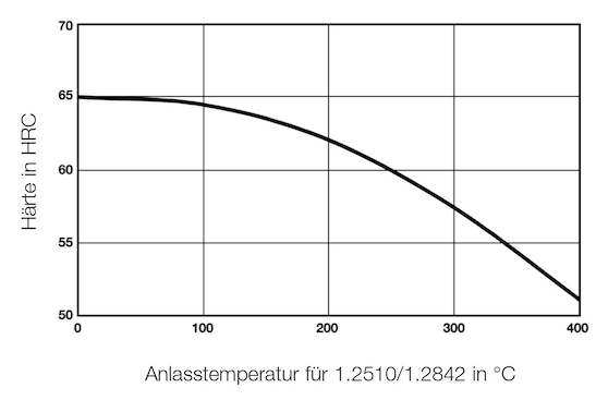Mindestens 2 Stunden mit anschließender Luftabkühlung (1 h/20 mm Werkstückdicke). Richtwerte für die erreichte Härte nach dem Anlassen bitten wir dem Anlassschaubild zu entnehmen.